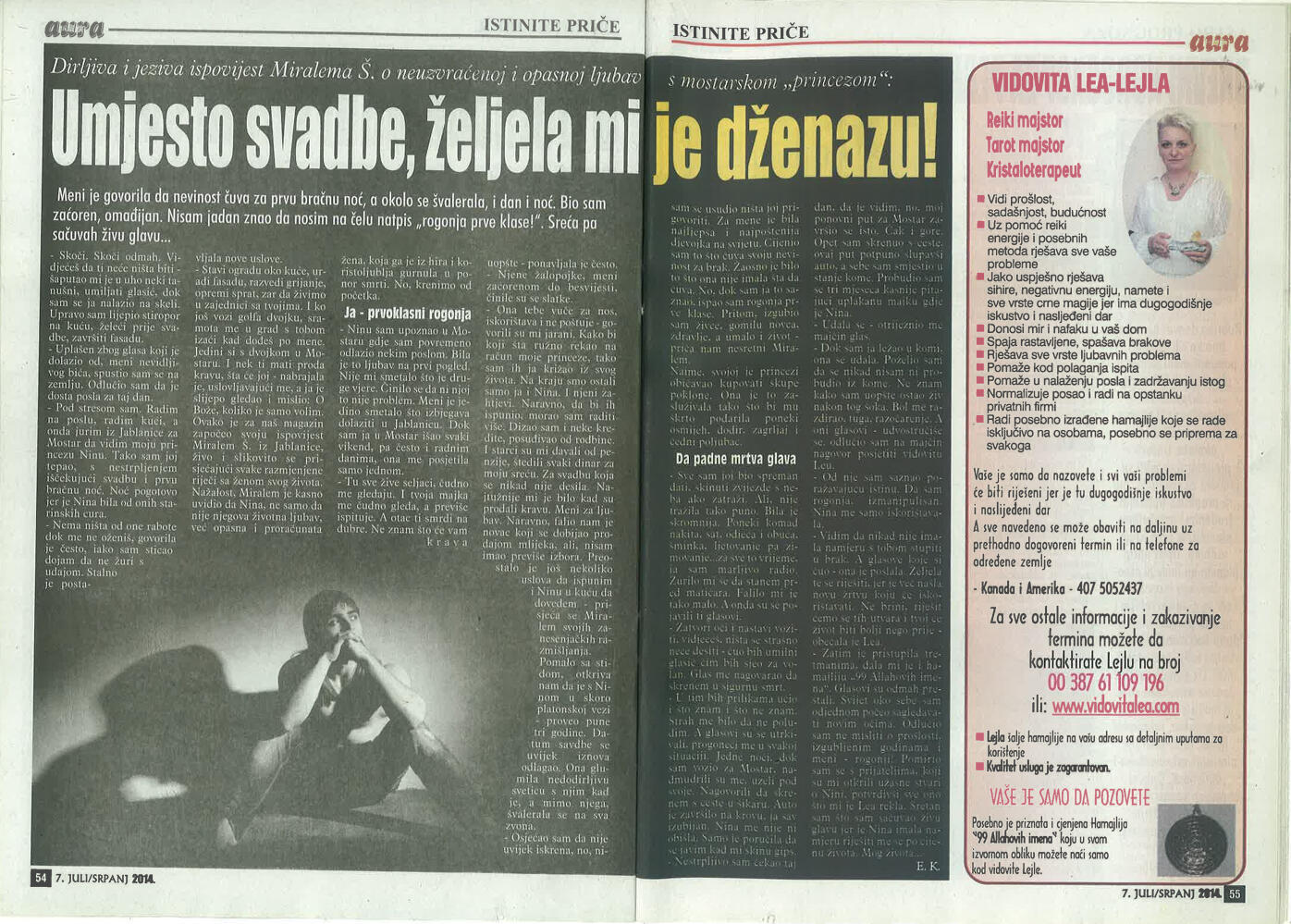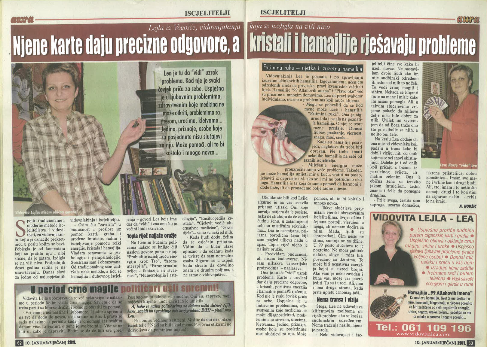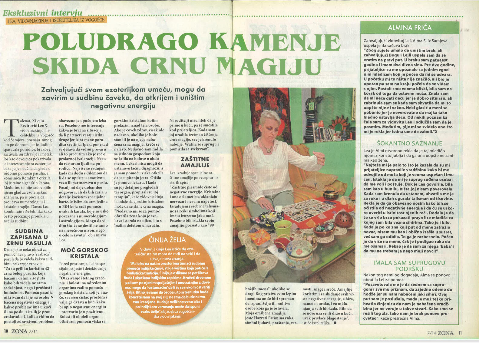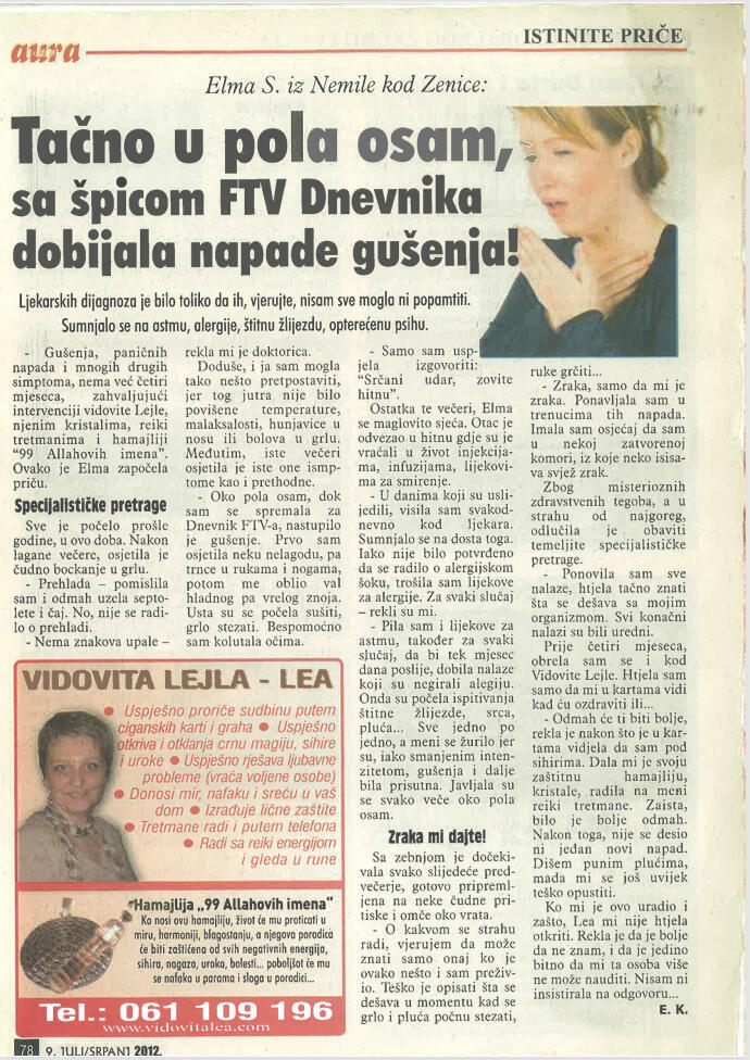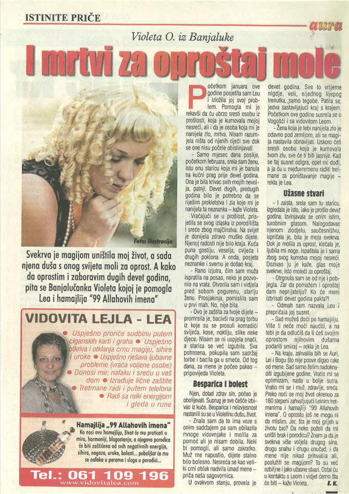 Uspješno proričem prošlost, sadašnjost i budućnost uz pomoć Tarot karata, graha, runa i viska, oslanjajući se na dugogodišnje iskustvo i snažan intuitivni uvid.Otkrivam prisustvo negativne energije, sihira i crne magije, te ih uklanjam pomoću urođenog dara, Reiki energije i rada s visokom, pozitivnom vibracijom.Uspješno skidam sihire i crnu magiju na daljinu, bez obzira na to gdje se nalazite, uz potpunu posvećenost i diskreciju.Svojim glasom i energetskim djelovanjem unosim mir, sklad i zaštitu u dom, pomažući da se narušena energija vrati u ravnotežu.Rješavam sve vrste ljubavnih problema – pomažem u pronalaženju puta srca, razrješavanju emotivnih blokada i vraćanju voljene osobe, ali isključivo onda kada između vas postoji istinska sudbinska povezanost.