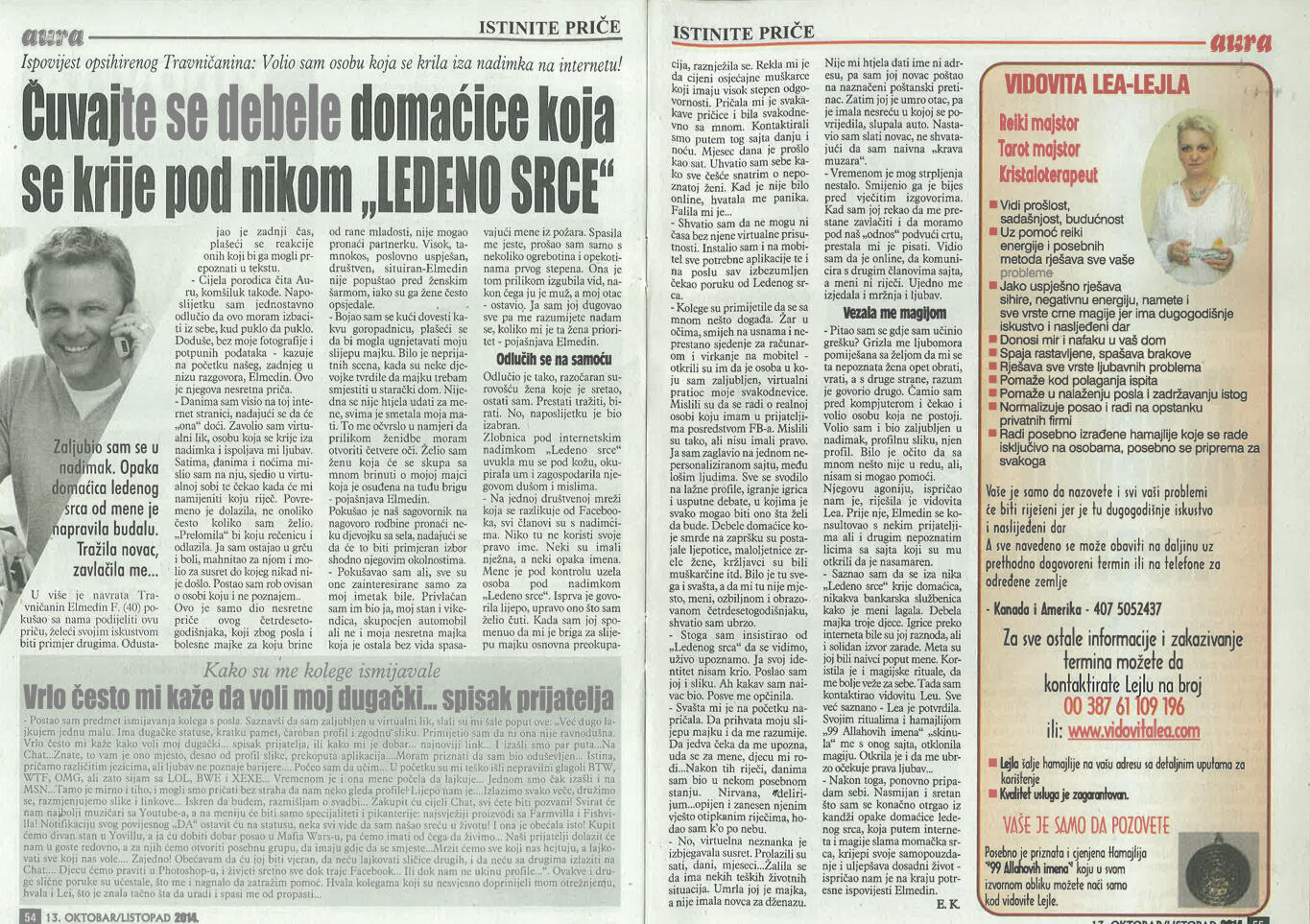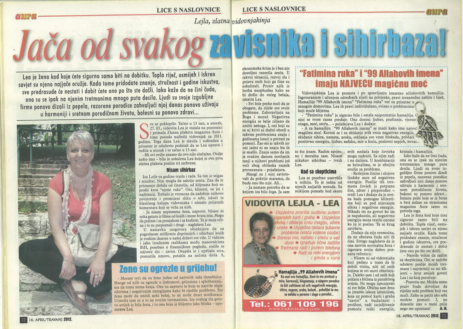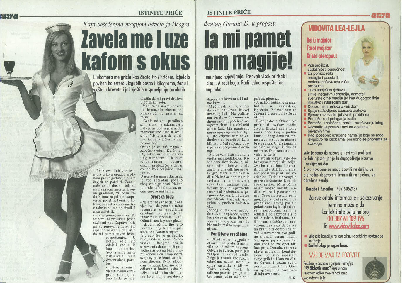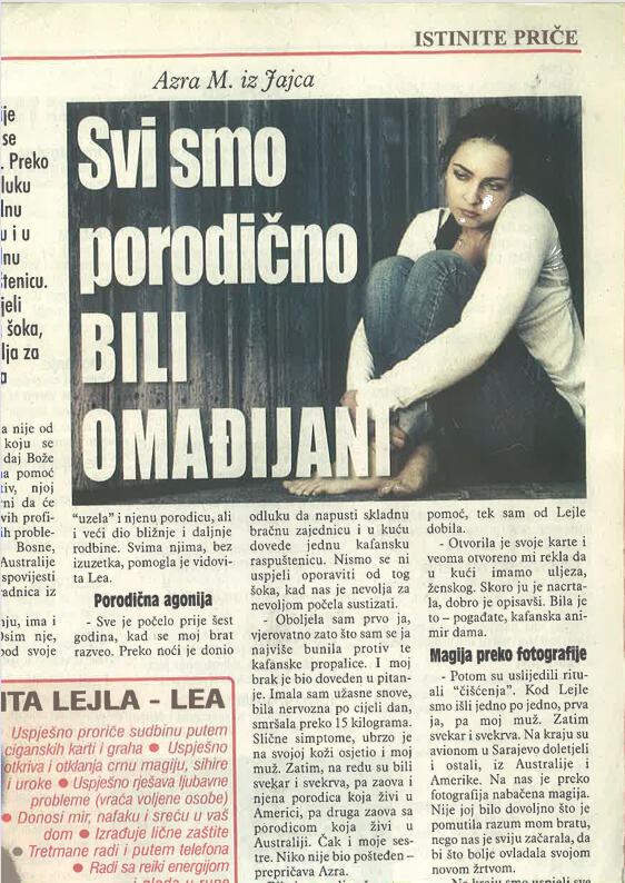 Uspješno proričem prošlost, sadašnjost i budućnost uz pomoć Tarot karata, graha, runa i viska, oslanjajući se na dugogodišnje iskustvo i snažan intuitivni uvid.Otkrivam prisustvo negativne energije, sihira i crne magije, te ih uklanjam pomoću urođenog dara, Reiki energije i rada s visokom, pozitivnom vibracijom.Uspješno skidam sihire i crnu magiju na daljinu, bez obzira na to gdje se nalazite, uz potpunu posvećenost i diskreciju.Svojim glasom i energetskim djelovanjem unosim mir, sklad i zaštitu u dom, pomažući da se narušena energija vrati u ravnotežu.Rješavam sve vrste ljubavnih problema – pomažem u pronalaženju puta srca, razrješavanju emotivnih blokada i vraćanju voljene osobe, ali isključivo onda kada između vas postoji istinska sudbinska povezanost.